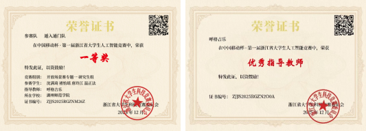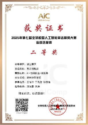 在2025年举办的第一届浙江省大学生人工智能竞赛中,理学院学子凭借扎实的专业功底和创新思维,荣获省级奖项5项,其中包括一等奖1项、三等奖4项,获奖数量占本校获奖总数的50%。呼格吉乐老师指导的学生团队荣获省一等奖,其本人荣获“优秀指导教师”称号。