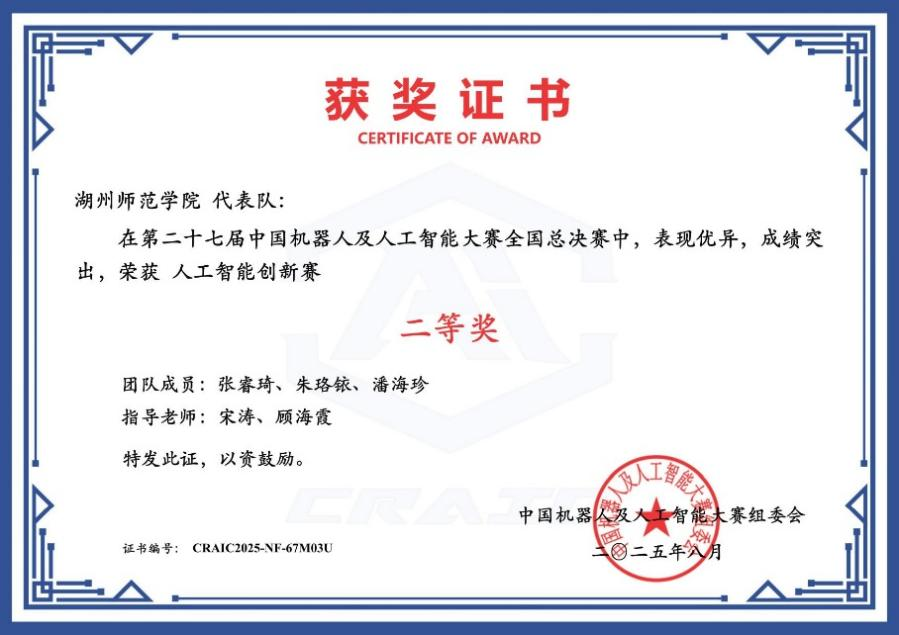 在第二十七届中国机器人及人工智能大赛这一全国性权威赛事中,理学院代表队表现突出,张睿琦、朱珞铱、潘海珍三位同学组成的团队在人工智能创新赛中获得全国二等奖,这是近五年该赛事的全校最好成绩,展现了理学院学子在人工智能算法设计和应用领域的创新潜力。近两年,理学院每年均积极组织校内选拔赛,为参加国赛选拔优秀人才,累计获得全国二、三等奖各1队,浙江省赛区二等奖2队、三等奖6队。