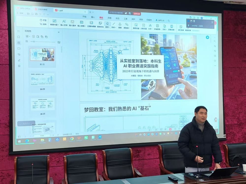 在分享中,彭德文先生结合深厚的行业经验,系统梳理了大模型与智能体的核心概念与技术架构。他不仅探讨了智能体开发、Vibe Coding等新兴编程范式及其对教育领域的潜在影响,还通过生动的实例,阐述了人工智能如何赋能教学、学习与未来工作。主讲人特别强调了主动适应技术变革、构建复合型知识体系对数学、统计与数据科学相关专业学生职业生涯的重要